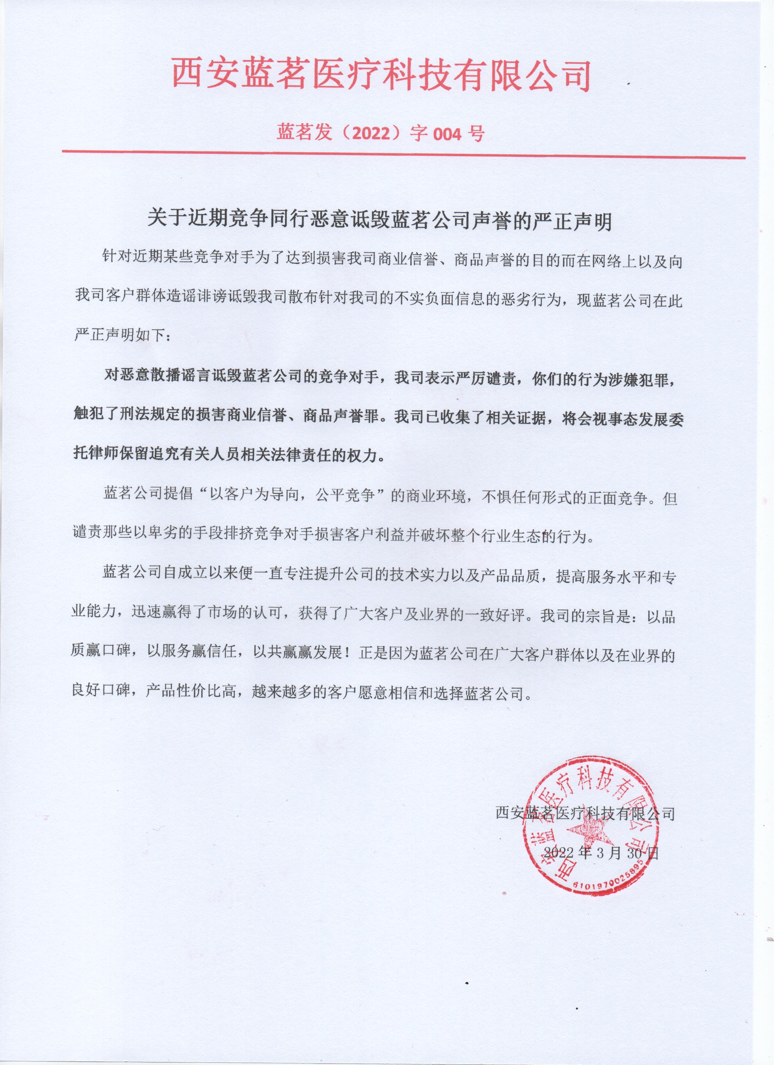近期發(fā)現(xiàn)某個(gè)同行利用各網(wǎng)絡(luò)平臺(tái)、搜索引擎資源及聯(lián)系我們客戶群體等方式散播關(guān)于西安藍(lán)茗的不實(shí)負(fù)面消息,惡意毀謗和攻擊西安藍(lán)茗醫(yī)療科技有限公司。 在此,西安藍(lán)茗醫(yī)療科技有限公司嚴(yán)正聲明,我們不會(huì)懼怕任何同行的詆毀和中傷,如繼續(xù)散播不實(shí)謠言,我們必將聯(lián)合合作的律師事務(wù)所,用法律的武器維護(hù)我們的權(quán)益。 致客戶: 藍(lán)茗自成立以來便一直專注提升自己的服務(wù)水平和專業(yè)能力,這幾年在行業(yè)內(nèi)風(fēng)聲水起,獲得業(yè)界的一致好評(píng)。所謂樹大招風(fēng),正是因?yàn)樗{(lán)茗在業(yè)界的口碑好,服務(wù)性價(jià)比高,越來越多的客戶愿意相信和選擇藍(lán)茗,使得原來在醫(yī)療行業(yè)渾水摸魚的公司不再那么滋潤(rùn),于是各種惡意的抹黑造謠等行為就開始在這些小公司的銷售間流行,有偽造對(duì)話記錄的,有發(fā)惡意貼的,有冒充藍(lán)茗員工騷擾客戶的,甚至有造謠藍(lán)茗公司倒閉的林林總總各種手段。 這些低級(jí)的的詆毀手段,相信經(jīng)銷商客戶以及院領(lǐng)導(dǎo)也曾經(jīng)有遇到過,自然能夠慧眼辨真假。 致同行: 這位同行,藍(lán)茗好不好不是您說了算,是這幾年的業(yè)績(jī)和業(yè)內(nèi)口碑說了算的。是的,藍(lán)茗的出現(xiàn),搶占了您的大多數(shù)客戶,在此我不想說抱歉,因?yàn)槟鞘强课覀兊膶?shí)力贏得的。換位思考,如果今天藍(lán)茗處在您的位置,我們只會(huì)努力提升自己,搶回屬于自己的客戶,而不會(huì)在此貶低比我們優(yōu)秀的同行。 所以,請(qǐng)您自重。 最后忠告您一句:成功的事業(yè)是靠強(qiáng)大的實(shí)力與客戶為第一基礎(chǔ)的,用心做好公司才是唯一的出路!